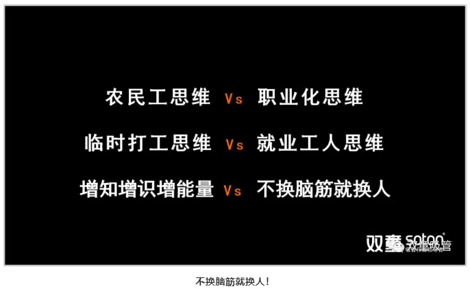 那么,“更換腦筋”就是要讓管理者從“農(nóng)民工思維”轉(zhuǎn)換為“職業(yè)化思維”,從“臨時打工思維”轉(zhuǎn)換為“就業(yè)工人思維”,徹底改變管理者“有事找領(lǐng)導(dǎo)、解決等指令”的惰性家長式管理方式,提高團(tuán)隊尋找問題、發(fā)現(xiàn)問題以及主動解決問題的能力,從而提升組織效率,以適應(yīng)這個不斷變化的時代。