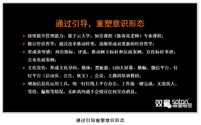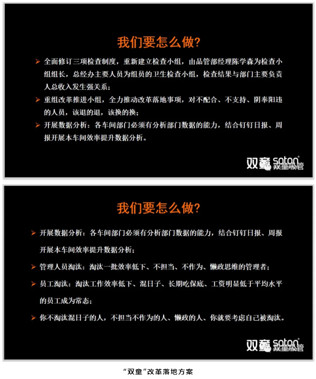 在樓仲平分享結(jié)束后,總經(jīng)理李二橋和大家分享了全面圍繞提升組織效率而展開的改革落地方案,包括重建“雙童”改革小組和安全衛(wèi)生秩序檢查小組、形成崗位競爭推動優(yōu)勝劣汰、推動車間數(shù)據(jù)分析能力、全面做好改革宣傳工作和文化引導(dǎo)工作、結(jié)合線上辦公平臺提升企業(yè)信息化水平等,在企業(yè)內(nèi)部建立起“以奉獻(xiàn)者為先、以奮斗者為本”的新時代價值觀!