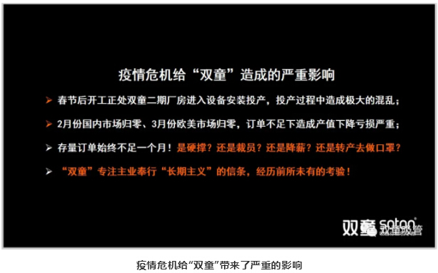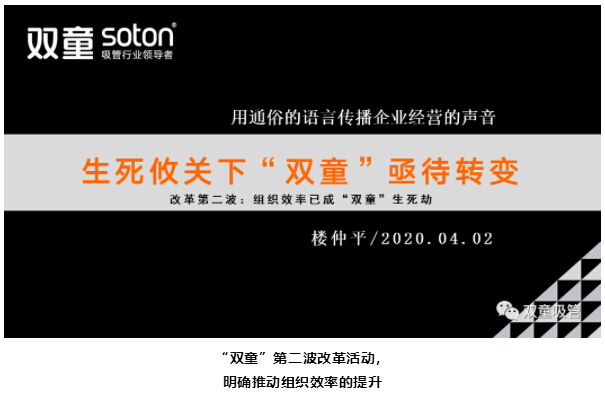 因此,在危機來臨之時,“雙童”并沒有恐慌,而是選擇抓住機會,迎接挑戰(zhàn)。但是在很多身邊的同行都開始轉(zhuǎn)行做口罩,做防疫物資的時候,奉行長期主義的“雙童”認(rèn)為,轉(zhuǎn)行踩風(fēng)口做口罩我們并不擅長。所以,4月2日,“雙童”開始推動企業(yè)第二波改革活動,明確推動組織效率的提升。