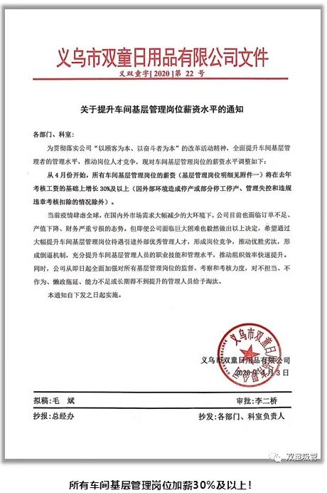 在危機裁員降薪風(fēng)潮盛行的當(dāng)下,恰恰是我們推動組織變革的好時機。所以,“雙童”借力于這樣一個機會,發(fā)布了加薪文件,給所有車間基礎(chǔ)管理崗位加薪30%及以上!也希望通過此舉引進(jìn)更多的優(yōu)秀管理人才,實現(xiàn)優(yōu)勝劣汰,從而激發(fā)組織中每個員工的積極性。