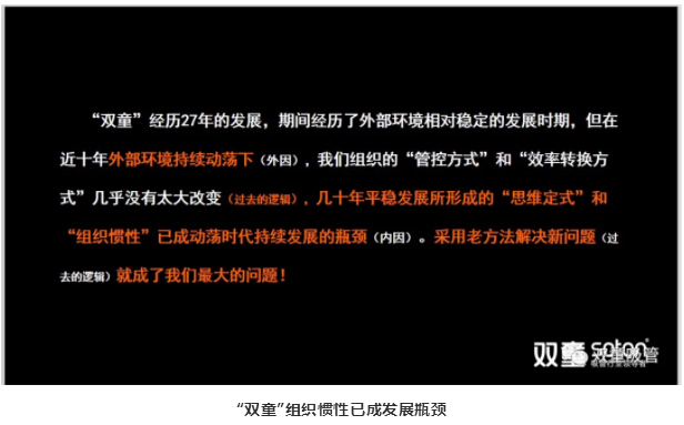 此外,我們還認(rèn)識到,疫情危機后,外部環(huán)境的動蕩性將持續(xù)加劇,過去的邏輯對未來逐漸失效,“雙童”幾十年平穩(wěn)發(fā)展所形成的“組織慣性”已經(jīng)成為了持續(xù)發(fā)展的瓶頸,因此,“雙童”積極推動組織做出改變。