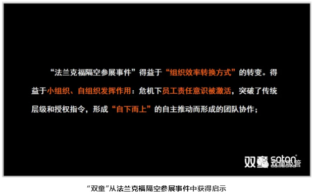 在這個過程中,組織效率發(fā)生了轉(zhuǎn)變,從以往的“要你做”,變成了現(xiàn)在的“我要做”,突破了指令的授權(quán),實現(xiàn)了團(tuán)隊的協(xié)作??梢哉f如果“雙童”沒有進(jìn)行組織轉(zhuǎn)變,這樣的事情就不太可能發(fā)生。