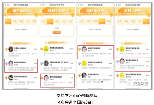 比賽進(jìn)行期間,義烏學(xué)習(xí)中心的小伙伴們絞盡腦汁、竭盡全力,讓義烏中心創(chuàng)新戰(zhàn)隊(duì)的成員陣容不斷擴(kuò)大,從而在幾百個(gè)創(chuàng)新戰(zhàn)隊(duì)中脫穎而出,創(chuàng)下了連續(xù)4天進(jìn)階全國(guó)前3名的好成績(jī)!