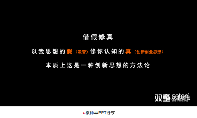 在整場(chǎng)課程的分享中,樓仲平始終從思維通道上展開分享,引導(dǎo)大家一定要學(xué)會(huì)“借假修真”,也就是以樓仲平思想的假(吸管)修同學(xué)們?cè)谡J(rèn)知上的真(創(chuàng)新創(chuàng)業(yè)思想)。