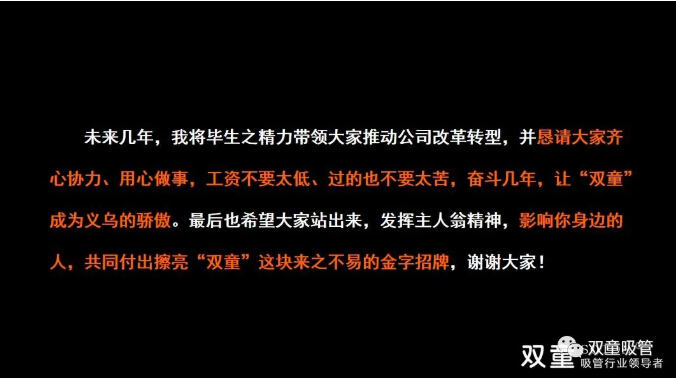 最后,樓仲平鄭重和大家承諾:未來(lái)幾年 ,我將帶領(lǐng)大家推動(dòng)公司改革轉(zhuǎn)型,希望大家齊心協(xié)力,用心做事,從而讓大家在付出血汗后,工資不會(huì)太低,過(guò)的不會(huì)太苦,少受委屈,獲得尊重。我會(huì)盡心盡力鼓勵(lì)你們,推動(dòng)你們,助長(zhǎng)你們,我們共同來(lái)支撐“雙童”走向未來(lái)!
