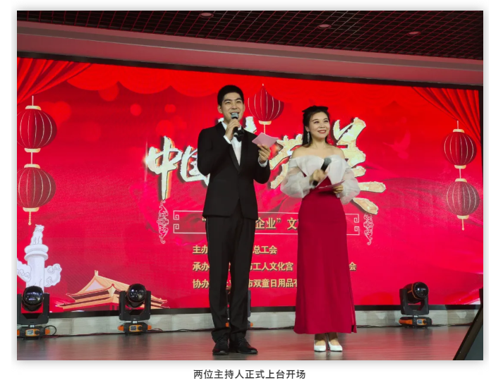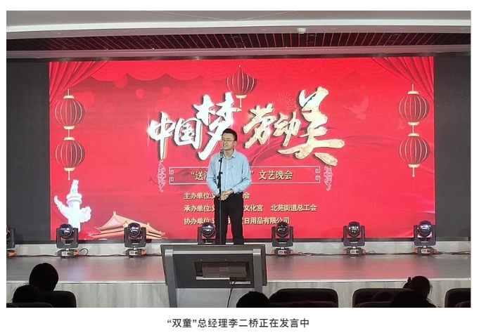 在晚會(huì)開(kāi)始前,“雙童”總經(jīng)理李二橋進(jìn)行了發(fā)言:“首先,我對(duì)義烏市總工會(huì)送演出進(jìn)“雙童”,表示衷心的感謝,對(duì)每一位精心準(zhǔn)備的表演者們表示衷心的感謝。二是我要感謝一下在場(chǎng)的所有員工,由于近期生產(chǎn)緊張,大家的工作也比較忙碌,感謝各位員工的努力付出和到場(chǎng)。最后,我祝愿本次義烏市總工會(huì)舉辦的送演出進(jìn)“雙童”文藝晚會(huì)圓滿成功!