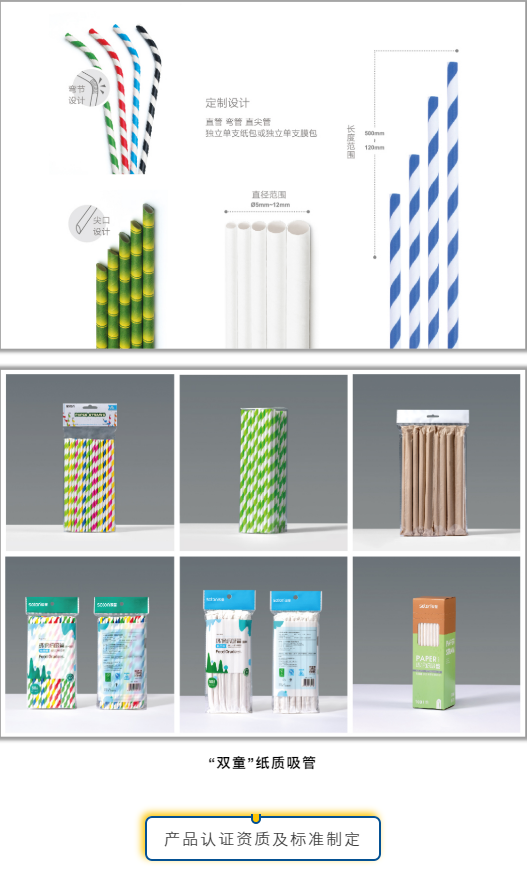 經(jīng)過多年研發(fā),“雙童”紙質(zhì)吸管目前已可制成直管、彎管、直尖管等形態(tài),實(shí)現(xiàn)了獨(dú)立單支紙包或獨(dú)立單支膜包,對直徑、長度、花色、包裝方式均可實(shí)現(xiàn)定制化生產(chǎn)。
