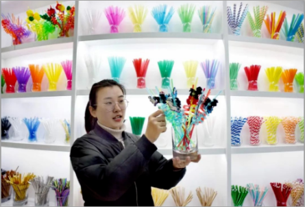 2020年12月22日,浙江義烏“雙童”董事長(zhǎng)樓仲平開心介紹展示新研發(fā)生產(chǎn)的可降解吸管。