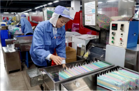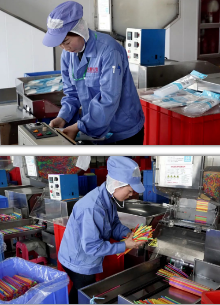 2020年12月22日,浙江義烏“雙童”員工在生產(chǎn)流水線上加班加點(diǎn)生產(chǎn)新研發(fā)、可食用的淀粉吸管。