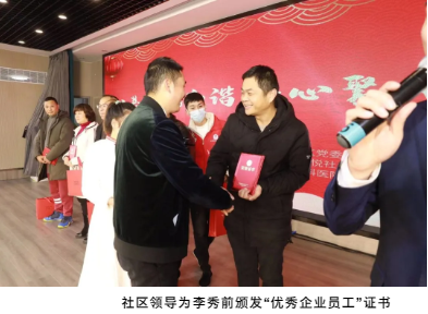 隨著晚會(huì)的高潮出現(xiàn),激動(dòng)人心的頒獎(jiǎng)環(huán)節(jié)也開始了。晚會(huì)對(duì)在疫情防控、文明創(chuàng)建、攻堅(jiān)克難任務(wù)中甘于奉獻(xiàn)、勇于擔(dān)當(dāng)?shù)钠髽I(yè)先進(jìn)工作者、優(yōu)秀志愿者、優(yōu)秀居民代表、網(wǎng)格標(biāo)兵、最具工匠精神者、傳承風(fēng)尚者予以表彰!值得一提的是,“雙童”員工李秀前被授予了“優(yōu)秀企業(yè)員工”榮譽(yù)稱號(hào)。