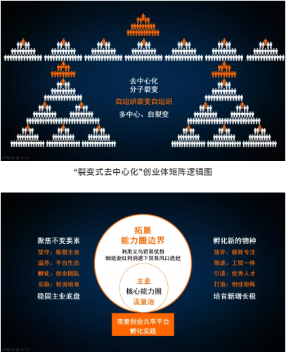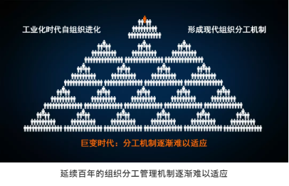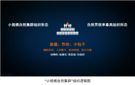 其中,樓仲平重點通過幾幅思維邏輯圖PPT,展現(xiàn)了在不同組織關(guān)系下的企業(yè)發(fā)展形態(tài)。從最原始的“小規(guī)模自然集群組織”邏輯圖上,我們能發(fā)現(xiàn)這種“雙層級”形式在規(guī)模較小時,編制靈活,人員精干,機動快速,戰(zhàn)斗力強,是十分高效的組織形態(tài)。但當(dāng)規(guī)模不斷擴張下,非常容易導(dǎo)致管理混亂的情況。