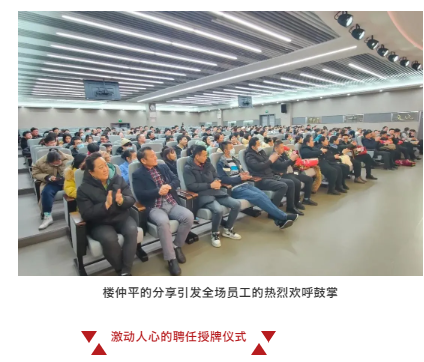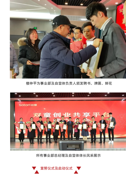 接下來,就是激動人心的聘任授牌儀式環(huán)節(jié)。所有事業(yè)部及自營體的負責(zé)人依次上臺,從樓仲平手中接過代表著責(zé)任和擔(dān)當(dāng)?shù)钠溉巫C書、榮譽牌匾及鮮花!