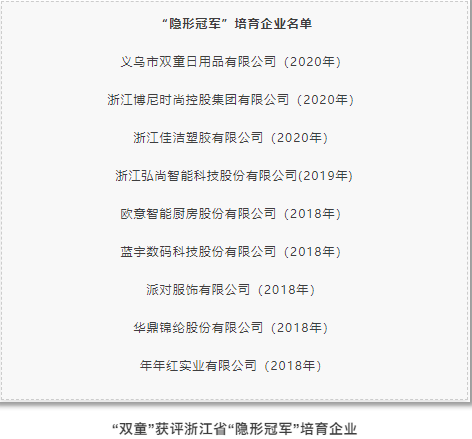 日前,浙江省經(jīng)濟(jì)和信息化廳公布2020年浙江省“隱形冠軍”企業(yè)和“隱形冠軍”培育企業(yè)的名單。“雙童”獲評省“隱形冠軍”培育企業(yè)!