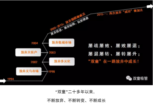 2003年,“雙童”放棄了多元經(jīng)營,放棄了低價貼牌加工的“大客戶”,提出了“兩條腿走路”和“小客戶原則”;