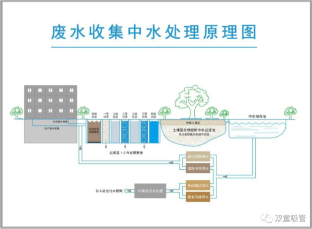 2020年年初,“雙童”二期新廠房投入使用,廢水收集中水回用系統(tǒng)在原來“雙童”一期廠房的基礎(chǔ)上進(jìn)行了大量的優(yōu)化和提升,讓員工日常生活中所產(chǎn)生的廢水不僅得到循環(huán)利用,而且還消滅了企業(yè)的廢水排放和污染,同時(shí)還為企業(yè)節(jié)省了大量水費(fèi)支出! “雙童”二期新廠區(qū):廢水收集中水處理原理圖 “雙童”二期新廠區(qū)節(jié)能降耗設(shè)計(jì)圖