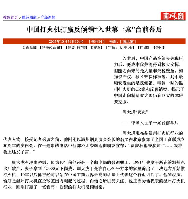 2003年9月,歐盟正式宣布,終止對(duì)中國(guó)打火機(jī)的反傾銷調(diào)查,這也是中國(guó)加入世貿(mào)組織后,民營(yíng)企業(yè)應(yīng)訴反傾銷的第一次勝利。