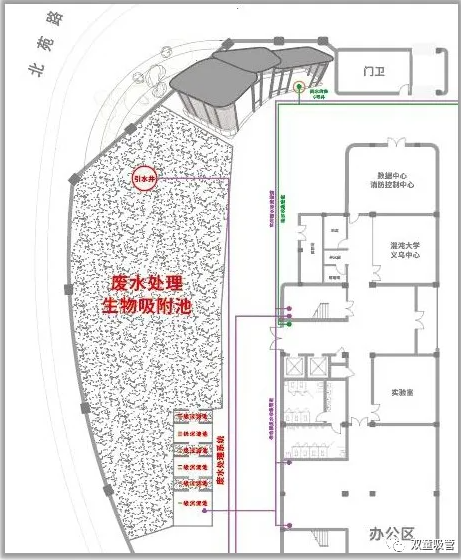 在這個過程中,員工日常生活中所產(chǎn)生的廢水過濾后,會流向生物吸附過濾池中,通過過濾池上栽種的樹木根須對水中的物質(zhì)、養(yǎng)分進(jìn)行再次吸附處理,這不僅能再次過濾處理廢水,同時也能讓樹木生長的越來越好。