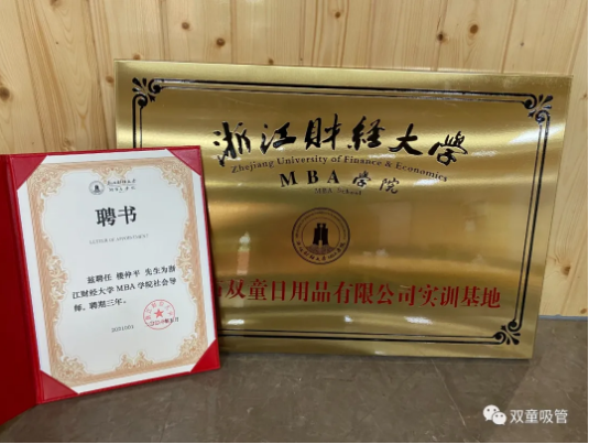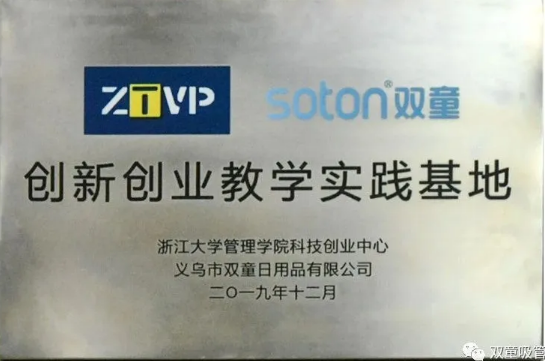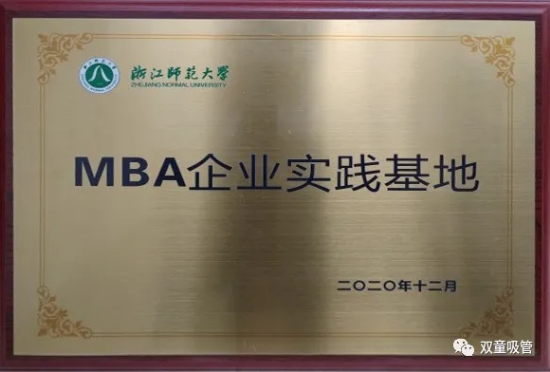 雙童團隊和浙江財經(jīng)大學(xué)調(diào)研團合影 事實上,多年來“雙童”始終積極參與產(chǎn)學(xué)研融合的工作,已與浙江大學(xué)、浙江師范大學(xué)、浙江理工大學(xué)和江西財經(jīng)大學(xué)等多所國內(nèi)高校保持密切合作關(guān)系,為校企共同發(fā)展提供資源共享平臺,為高水平人才培養(yǎng)提供了有力支撐。 浙江大學(xué)創(chuàng)新創(chuàng)業(yè)教學(xué)實踐基地牌匾 浙江師范大學(xué)MBA企業(yè)實訓(xùn)基地牌匾