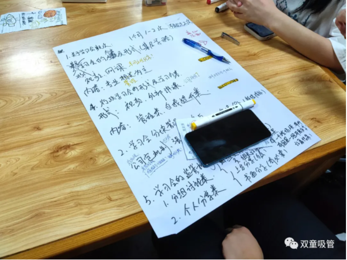 樓仲平的分享,引發(fā)了大家的共鳴和一致認可。因此,雙童的小伙伴們針對五個提問,分組對學習會機制進行了分析討論(自營體長組,生產(chǎn)中高層組,品管研發(fā)組,行政組,銷售人員組)。