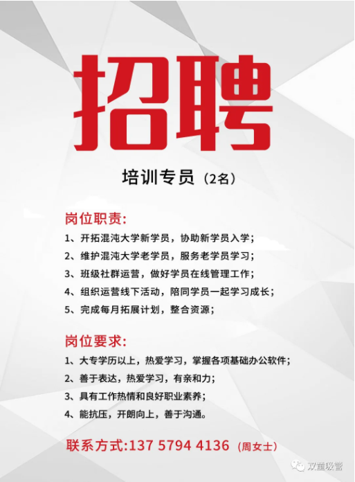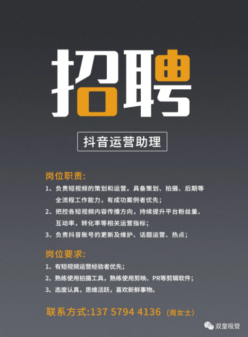 ?? 抖音運(yùn)營及培訓(xùn)專員崗位 聯(lián)系方式:137 5794 4136 (周女士)