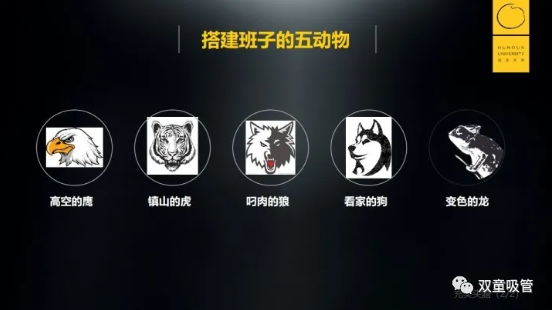 汪建國(guó)談及公司搭班子時(shí),選擇了五種動(dòng)物來(lái)形象化的作比喻,分別是鎮(zhèn)山的虎、高空的鷹、叼肉的狼、看家的狗以及變色的龍。配備好一個(gè)強(qiáng)力團(tuán)隊(duì)首要的是站穩(wěn)腳跟,讓每一個(gè)成員各司其職,充分挖掘潛能、展現(xiàn)能力。
