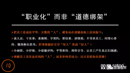 在“理性”思維的持續(xù)引導下,“雙童”在文化中倡導把員工看成是平等、完整的“人”,而非站在道德高地上居高臨下,處處體現尊重、公平和雙贏。我們理解員工是有血有肉的“人”,而非單純的勞動力,對待員工少“畫餅”,少抒情,懂得換位思考,不去“道德綁架”員工,才能讓員工真正產生歸屬感。