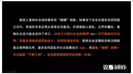“熵”,是來(lái)自于物理學(xué)熱力學(xué)第二定律的一個(gè)詞。“熵增定律”意指在任何“孤立而封閉”系統(tǒng)中,其系統(tǒng)無(wú)序度必然增加,最終會(huì)達(dá)到“熵”的最大值“死寂”。簡(jiǎn)單理解就是:任何一個(gè)人,任何一個(gè)組織,乃至于任何一個(gè)家庭,如果你把自己封閉起來(lái),你的內(nèi)部一定是從有序到無(wú)序。如果你繼續(xù)封閉,它的混亂程度一定會(huì)達(dá)到最大值,一直到死寂。“雙童”樓仲平也曾多次在課程分享中引用熱力學(xué)第二定律的“熵增定律”,把“雙童”存在的問(wèn)題通過(guò)自然的現(xiàn)象加以挖掘、頗析、呈現(xiàn)、對(duì)照,從而來(lái)尋求問(wèn)題解決的方法。樓仲平分享的“熵增定律”P(pán)PT頁(yè)面