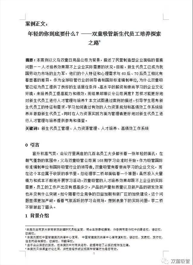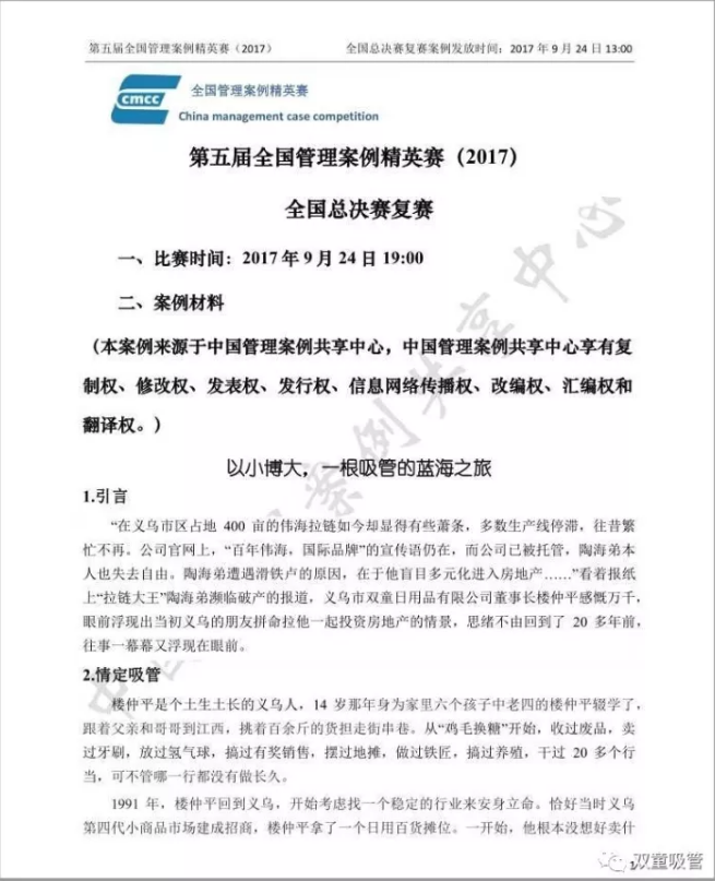 截止到目前,以“雙童”為主題的案例進(jìn)入到國(guó)家案例庫(kù)的數(shù)量就高達(dá)5件。其中南京商學(xué)院研究案例《年輕的你到底要什么?——雙童吸管新生代員工培養(yǎng)探索之路》、浙江工業(yè)大學(xué)研究案例《以小博大,一根吸管的藍(lán)海之旅》兩件研究案例更是被評(píng)為了2016年度百優(yōu)案例!浙江工業(yè)大學(xué)研究案例《以小博大,一根吸管的藍(lán)海之旅》還成為了2017年精英賽總決賽的案例!