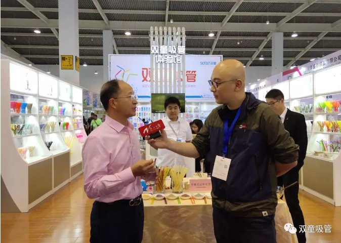 “雙童”展位的門前,除了來往賓客,還有各大媒體前來探訪。關(guān)于“一根吸管”的奧秘,廣大媒體朋友都抱以極大的好奇,“雙童”的當(dāng)家人樓仲平也會(huì)在展位上為他們一一解答所有的疑問。