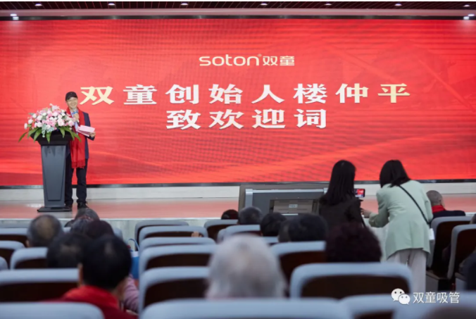 參觀完廠區(qū),家人們一起來到大會堂,樓仲平為大家致歡迎詞。他深情地對村里的長輩家人表示感謝: