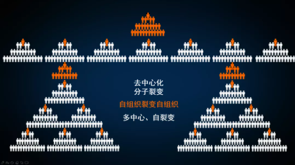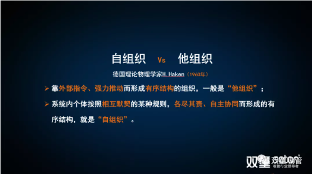 一句話總結(jié)就是把大的企業(yè)做小,做成層級簡單、編制靈活的“自組織”結(jié)構(gòu)創(chuàng)業(yè)體來解決企業(yè)的持續(xù)發(fā)展。那么何為“自組織”?