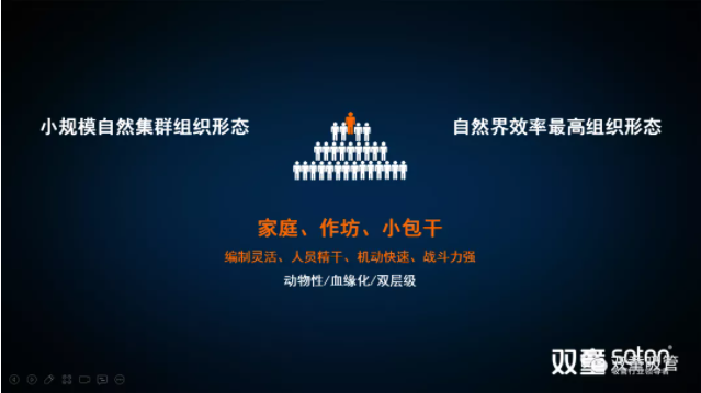 樓老師通過蟻群、猴群、魚群等自然界案例和思維邏輯圖,向大家展現(xiàn)了自然界當(dāng)中普遍存在的自然組織形態(tài)。這種基于動物性、血緣化本能而形成的雙層結(jié)構(gòu)的組織形式由于其編制靈活、人員精干、機(jī)動快速而戰(zhàn)斗力強(qiáng),是自然界當(dāng)中存在億萬年之久的十分高效的組織形態(tài)。