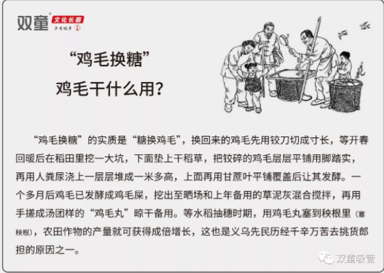 現(xiàn)在很多年輕人都搞不明白,為什么當(dāng)時(shí)義烏人要拿“雞毛”去換糖?這個(gè)“雞毛”有什么用? 其實(shí),雞毛的用處還是挺多的! 14歲小貨郎挑貨郎擔(dān)