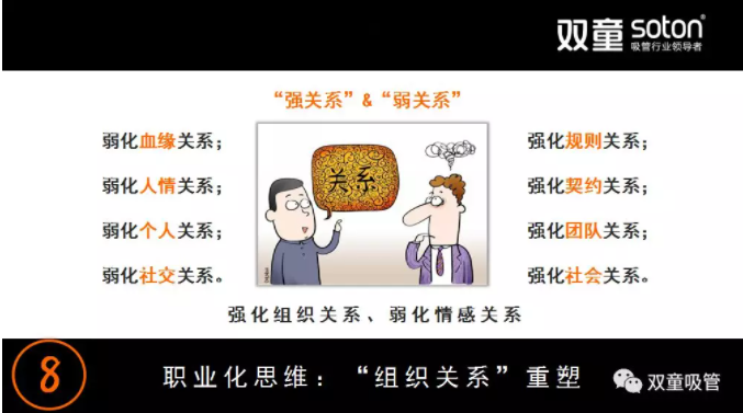 在現(xiàn)代社會中,不少人把企業(yè)經(jīng)營管理與人情社交關(guān)系掛鉤。于是,他們過于注重個人的社交和人情關(guān)系,整天忙于各種社交,從而希望取得所謂的社交關(guān)系!但企業(yè)發(fā)展到一定規(guī)模時,僅靠個人的社交關(guān)系是無法建立企業(yè)健康的社會關(guān)系。弱化血緣關(guān)系,強化規(guī)則關(guān)系