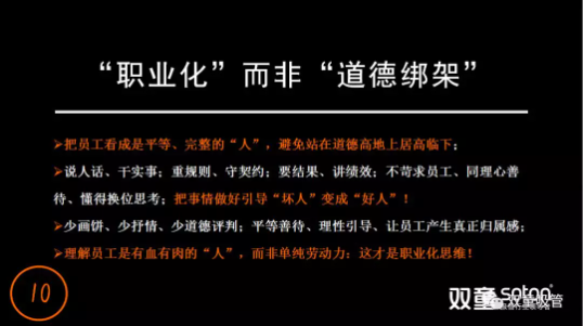 在“理性”思維的持續(xù)引導(dǎo)下,“雙童”在文化中倡導(dǎo)把員工看成是平等、完整的“人”,而非站在道德高地上居高臨下,處處體現(xiàn)尊重、公平和雙贏。我們理解員工是有血有肉的“人”,而非單純的勞動(dòng)力,對(duì)待員工少“畫餅”,少抒情,懂得換位思考,不去“道德綁架”員工,才能讓員工真正產(chǎn)生歸屬感。