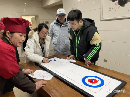 桌上冰壺看起來不大,難度系數(shù)卻爆表了!吸管妞試過幾次都沒能成功,一下子對冰壺這個游戲肅然起敬了!然而,讓吸管妞感到意外的是,“雙童”的“選手們”卻紛紛在游戲現(xiàn)場大顯神通,讓妞大開眼界!