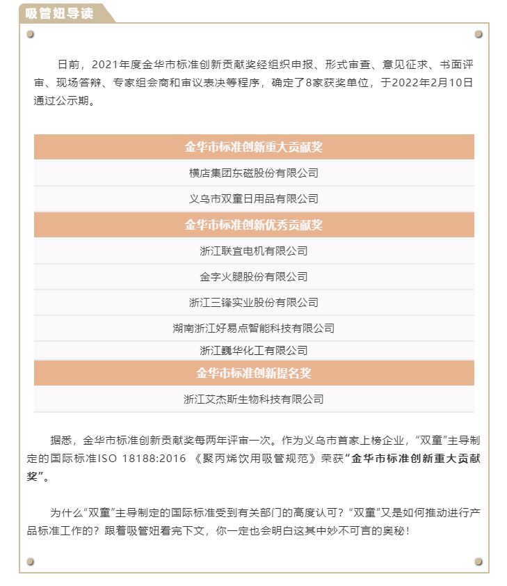 義烏市雙童日用品有限公司給出的答案不是低價競爭,也不是規(guī)模效應(yīng),而是掌握制定標準的話語權(quán)。一路走來,“雙童”先后投入上千萬元巨資,主導起草了吸管產(chǎn)業(yè)的團體標準、行業(yè)標準、國家標準和ISO國際標準。
