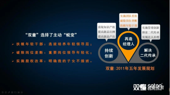2010年,樓仲平在理解人性活力的“自然遞減”的現(xiàn)象以及經(jīng)理人老化自然規(guī)律后,下定決心通過《雙童五年發(fā)展規(guī)劃》的組織變革來實(shí)施解決“經(jīng)理人老化”問題:明確扶植年輕干部,選拔培養(yǎng)優(yōu)秀的年輕領(lǐng)導(dǎo)層,解決二代傳承接班等問題。