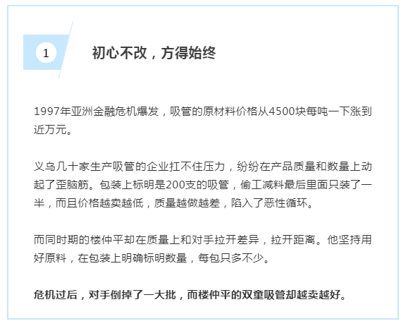 一流的企業(yè)賣標(biāo)準(zhǔn),二流的企業(yè)賣品牌,三流的企業(yè)賣產(chǎn)品。“雙童”始終踐行“以小博大,成就另一種高度”的經(jīng)營理念,堅(jiān)持以博大的胸懷,將吸管做精、做強(qiáng)、做到極致。