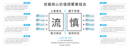 “致力成長,協(xié)同更生”是雙童的核心價(jià)值觀,同時(shí)兩句話可以拆分為“流”和“慎”兩個(gè)要素?!傲鳌笔侵钙髽I(yè)在高速變化的市場環(huán)境下,要像水一樣有序流動(dòng),保持創(chuàng)新,不斷更新發(fā)展方式?!吧鳌弊秩∽砸捉?jīng),是小心謹(jǐn)慎的意思,指我們在不斷追求吸管行業(yè)主導(dǎo)地位的同時(shí),也一定要小心謹(jǐn)慎,“做一家有利于社會(huì)的好企業(yè)”,這句話同時(shí)也是雙童的愿景之一。