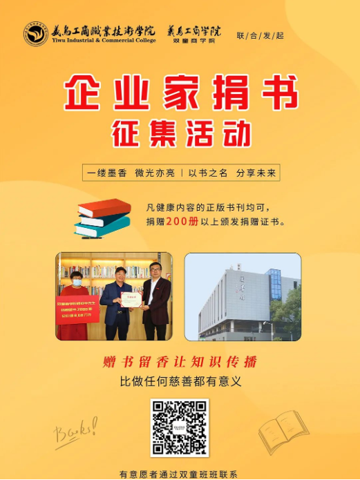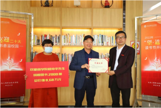在現(xiàn)場圖書捐贈活動中,樓仲平為義烏工商學(xué)院圖書館捐贈了價值近9萬元的2000冊圖書。