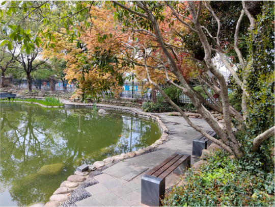 池中魚兒和水面倒影形成一幅絕美的畫卷