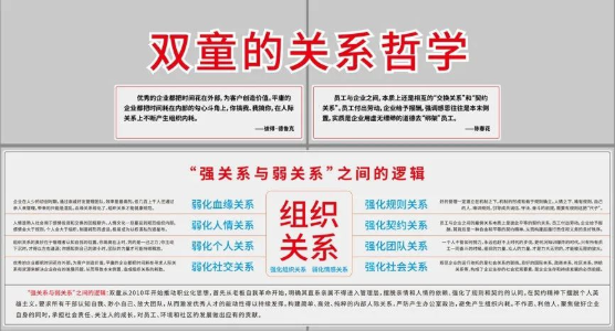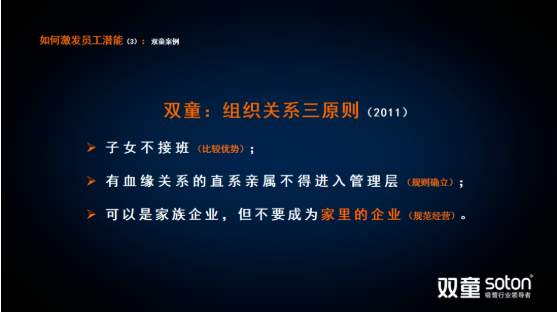 做“家族企業(yè)”還是家里的企業(yè)?其實(shí),兩者之間的界限就在于是否規(guī)范經(jīng)營(yíng),這一點(diǎn)在“雙童”的關(guān)系哲學(xué)的“強(qiáng)關(guān)系與弱關(guān)系”中也有體現(xiàn)。弱化血緣關(guān)系,強(qiáng)化規(guī)則關(guān)系;弱化人情關(guān)系,強(qiáng)化契約關(guān)系;弱化個(gè)人關(guān)系,強(qiáng)化團(tuán)隊(duì)關(guān)系;弱化社交關(guān)系,強(qiáng)化社會(huì)關(guān)系。