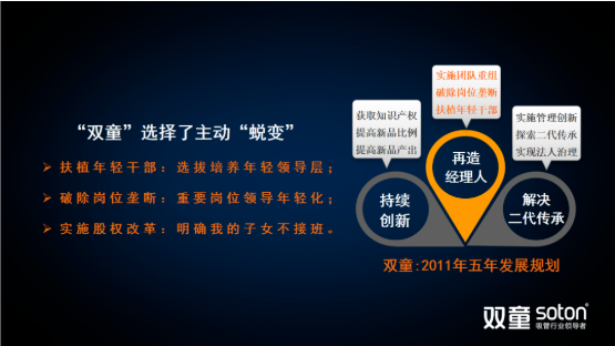 2010年前后,大部分管理層由于年齡偏大,逐漸難以適應(yīng)數(shù)據(jù)化環(huán)境帶來(lái)的挑戰(zhàn),管理上創(chuàng)新不足,奮斗意識(shí)開始持續(xù)下降,“雙童”因此選擇主動(dòng)“蛻變”,調(diào)整管理人員結(jié)構(gòu),并在組織關(guān)系原則中明確有血緣關(guān)系的直系親屬不得進(jìn)入管理層,作為巨變時(shí)代下的自救手段。