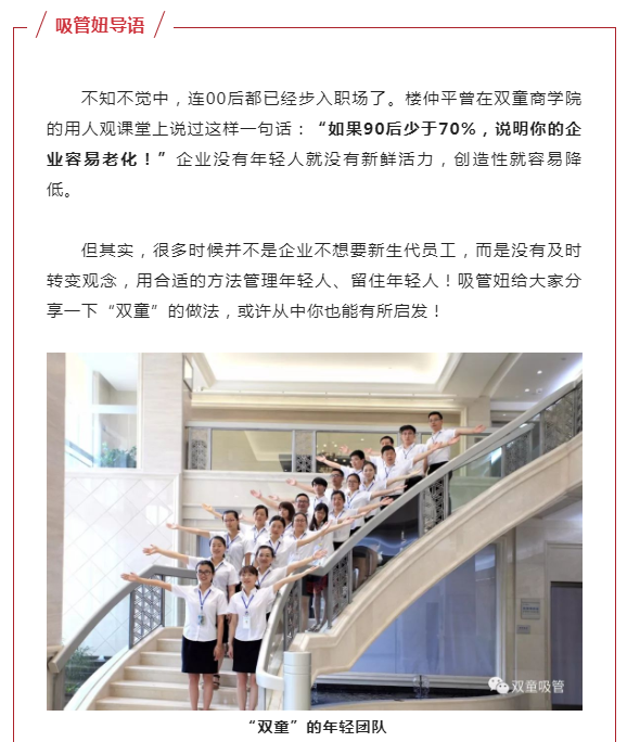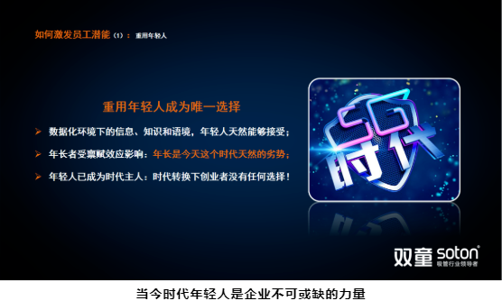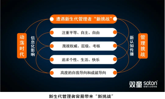 新生代員工的成長環(huán)境塑造了他們的性格,認(rèn)知方式也會不同于其他時代的人。一旦老板與員工的認(rèn)知不同,那就很難達(dá)成思想同頻,自然會有沖突。這些沖突正是“年輕人不好管”這種觀念產(chǎn)生的源頭。“雙童”用這個方式解答這一沖突:用年輕人去管理年輕人,敢于授權(quán)給年輕人,運(yùn)用新生代的力量突破巨變時代下企業(yè)發(fā)展的局限。