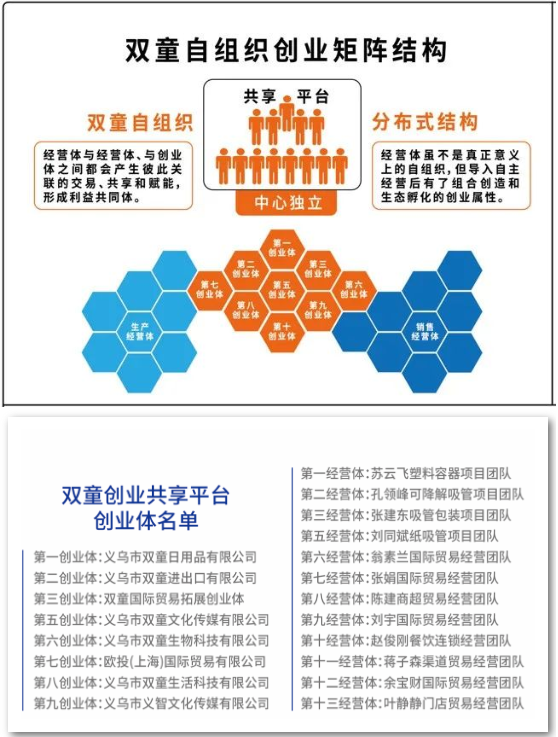 通過近五年的自組織裂變,雙童成立了八大創(chuàng)業(yè)體及十二個經(jīng)營體,形成了自裂變、自生長的創(chuàng)業(yè)生態(tài)。