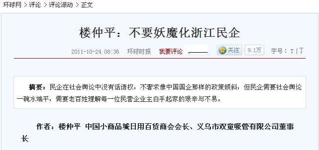 日前,某報(bào)刊登了一篇內(nèi)容為"義烏老板假破產(chǎn)真移民"的長篇報(bào)道,作者以偏概全的不實(shí)報(bào)道對(duì)義烏民營企業(yè)地形象產(chǎn)生了極大的不良影響,對(duì)此,雙童當(dāng)家人樓仲平依據(jù)30多年來對(duì)義烏市場(chǎng)的了解,在《環(huán)球時(shí)報(bào)》上發(fā)表文章《不要妖魔化浙江民企》,澄清義烏民企現(xiàn)狀,抵制不實(shí)報(bào)道,為義烏民企正名。