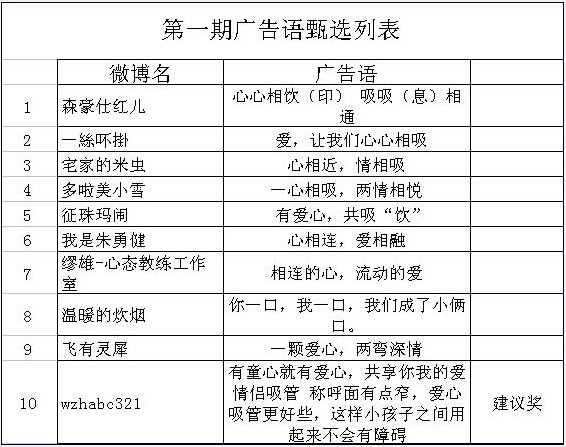 本期投票活動是6月11-15日開展的第二期“愛心吸管”廣告語征集活動的一個延續(xù),活動將在第二期甄選的優(yōu)秀廣告語中由網(wǎng)友投票選擇出最佳廣告語,獎品設(shè)置如下: