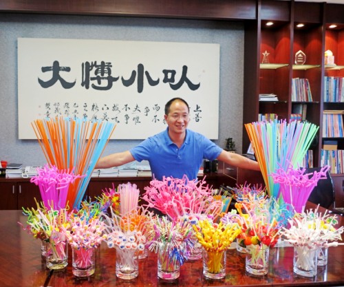 在雙童樣品間里,能看到各種造型的藝術(shù)吸管,供兩人共吸的情侶吸管、帶有風(fēng)車的玩具吸管、能做成眼鏡框的藝術(shù)吸管、能測溫變色的多功能吸管,還有能幫助小孩子吃藥的功能吸管……據(jù)說這些吸管大多都是樓仲平創(chuàng)意、設(shè)計的。