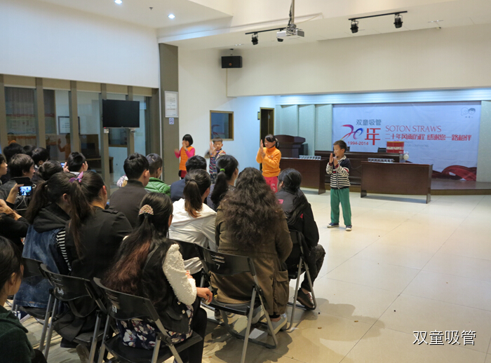 首先,這期生日會的第一個不同之處,就是參與生日會的人員注入了新鮮的血液!我們請來了第三代雙童人——隨父母居住在雙童的孩子們,為壽星們跳了一段熱情洋溢的舞蹈——《小蘋果》!看著孩子們駕輕就熟的表演,吸管妞也鬼馬地讓他們的“生產(chǎn)商”廠長李秀前和廠長夫人上臺,讓孩子們教兩位如何跳“小蘋果”!一番折騰下來,不僅讓在座的各位壽星笑得前仰后合,更讓跳的手腳不知道怎么放的廠長李秀前感嘆道:長江后浪推前浪,前浪死在沙灘上??!